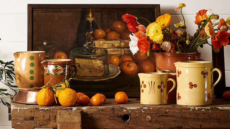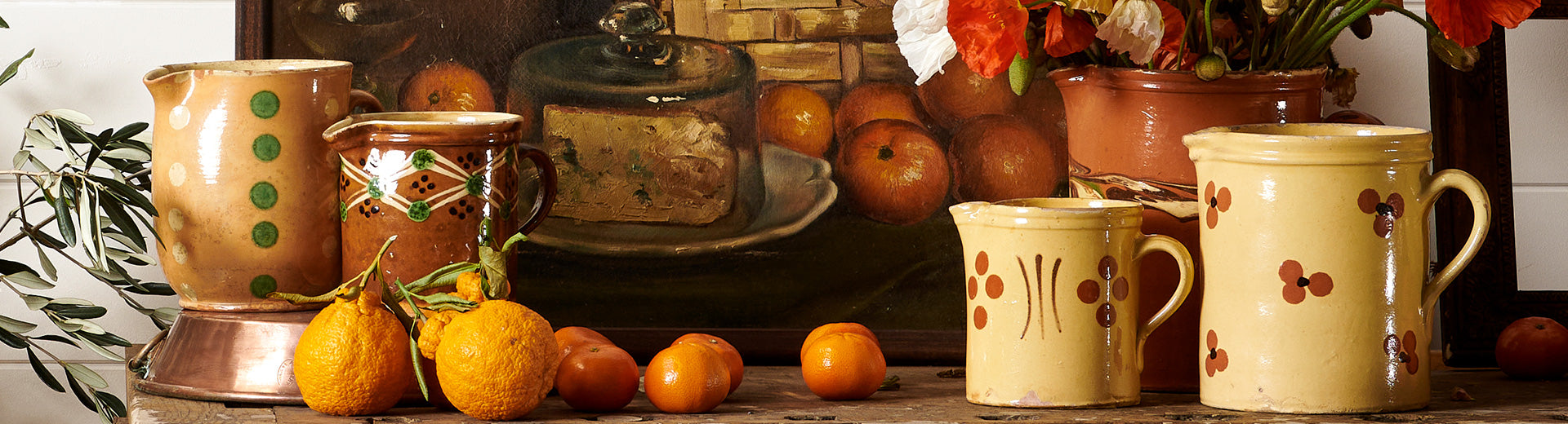 Vintage French glazed earthenware jug from the French Alps with marbled design