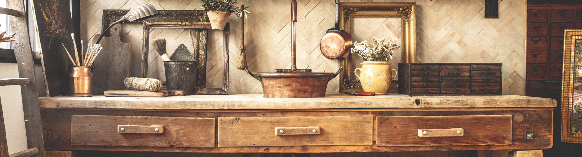 Antique French rustic Etabli work bench from a farmhouse in Chamonix with aged paint splatters and a charming aged patina
