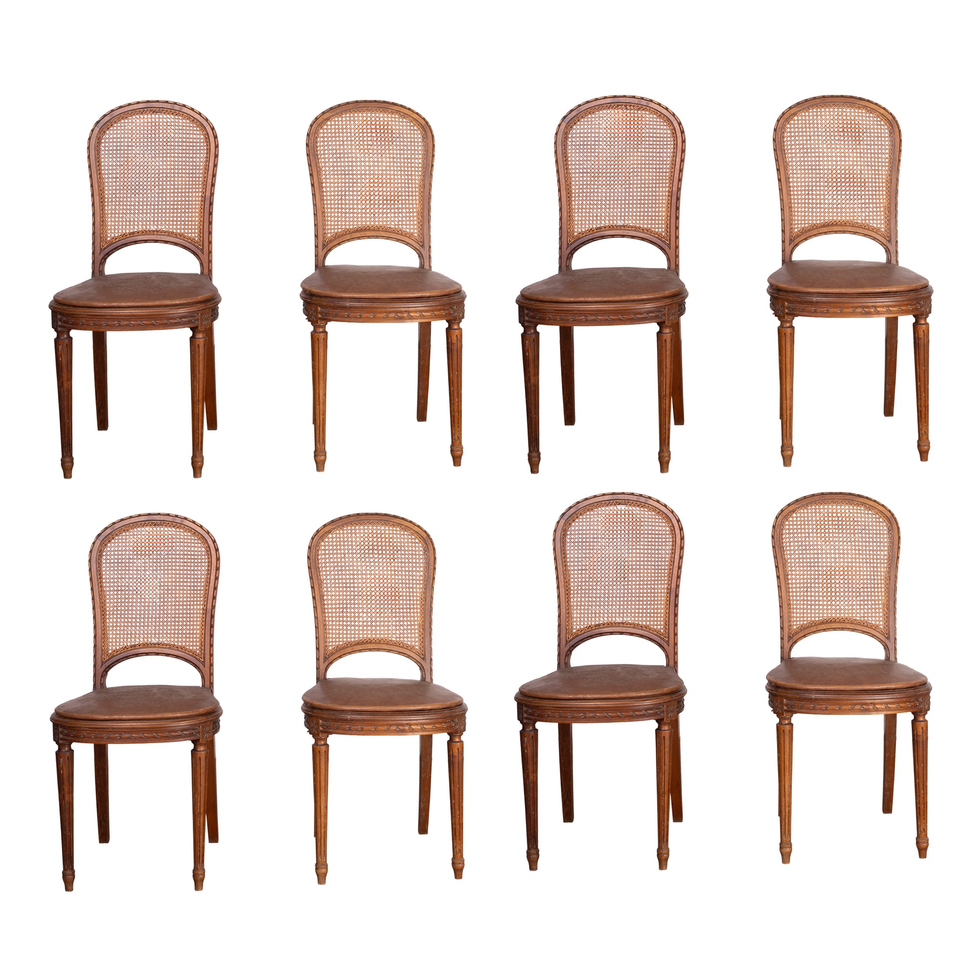 Set of 8 Antique French cane bistro dining chairs with removable leather seat pads from Paris