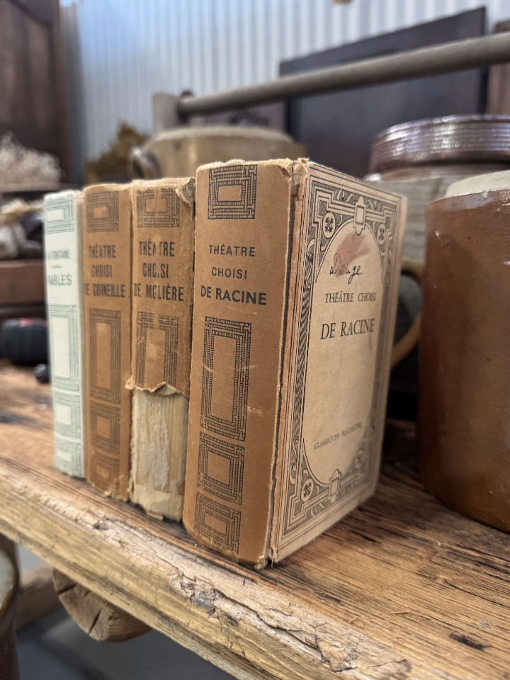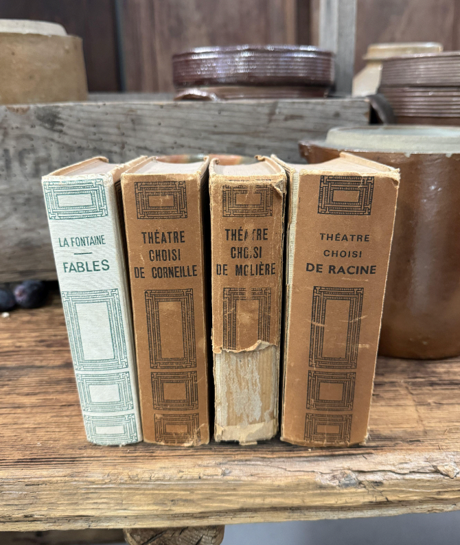 A stack of 4 vintage French hard back books of Theatre and Fables found in Provence