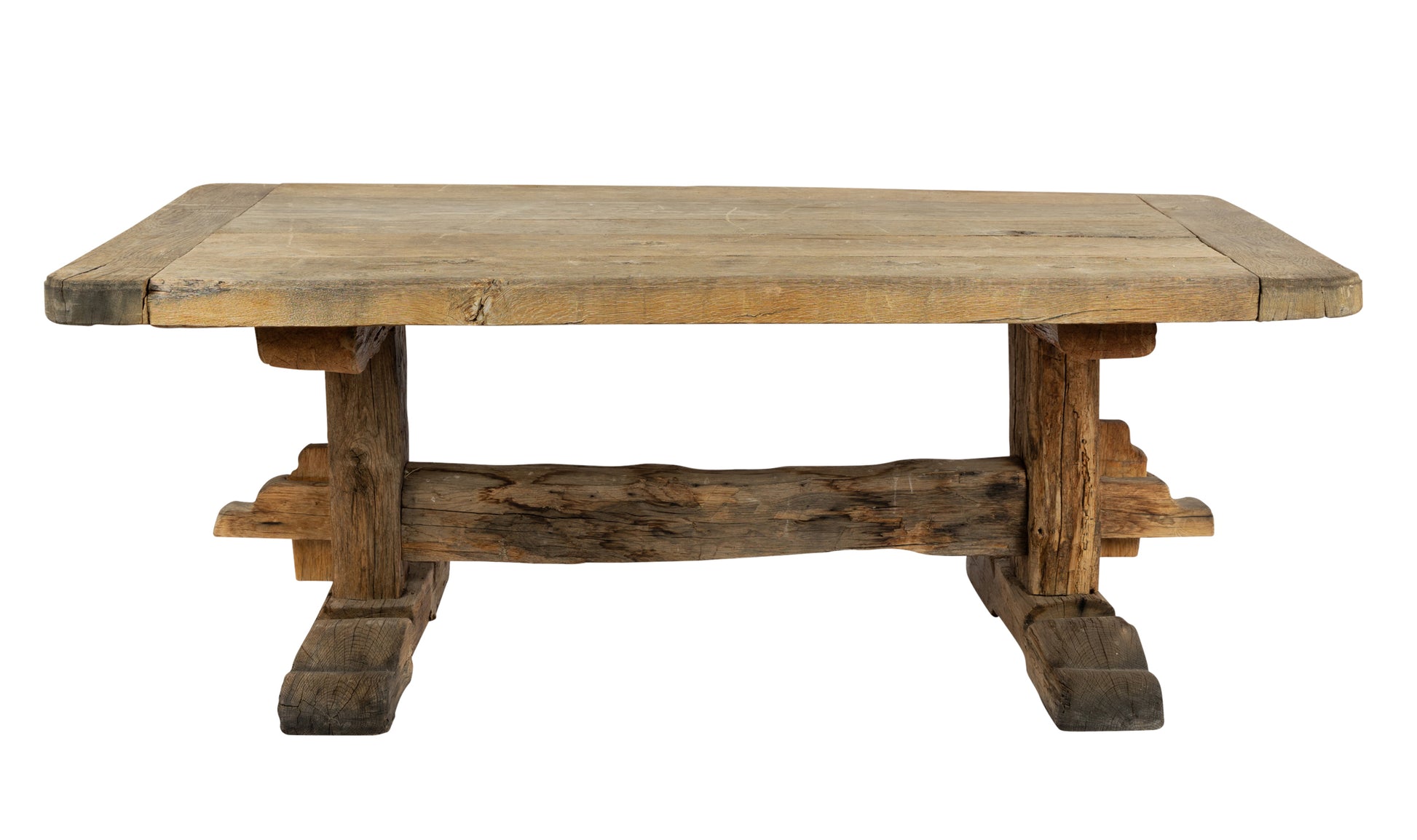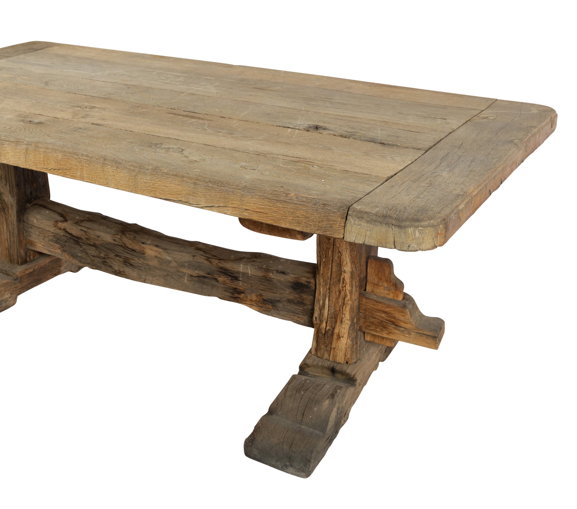 An excellent French 19th century rustic antique oak table with impressive stretcher base