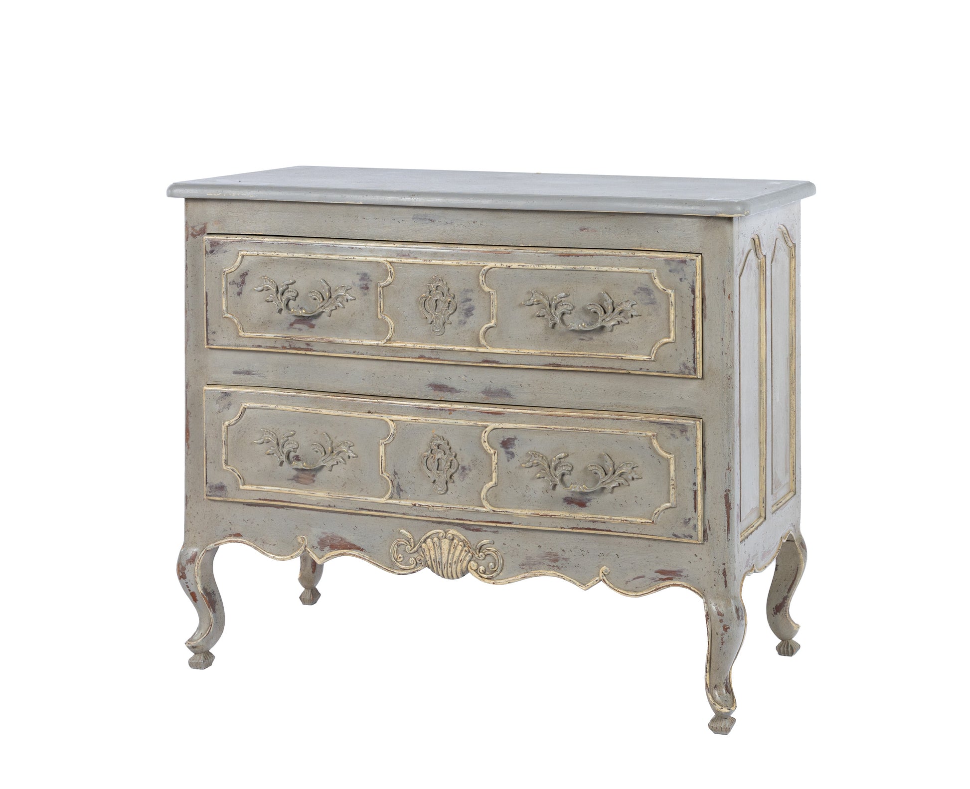 Antique French Louis XV style commode with a lovely time worn grey patina and hand carved coquille shell carvings and raised panel drawer fronts from Provence