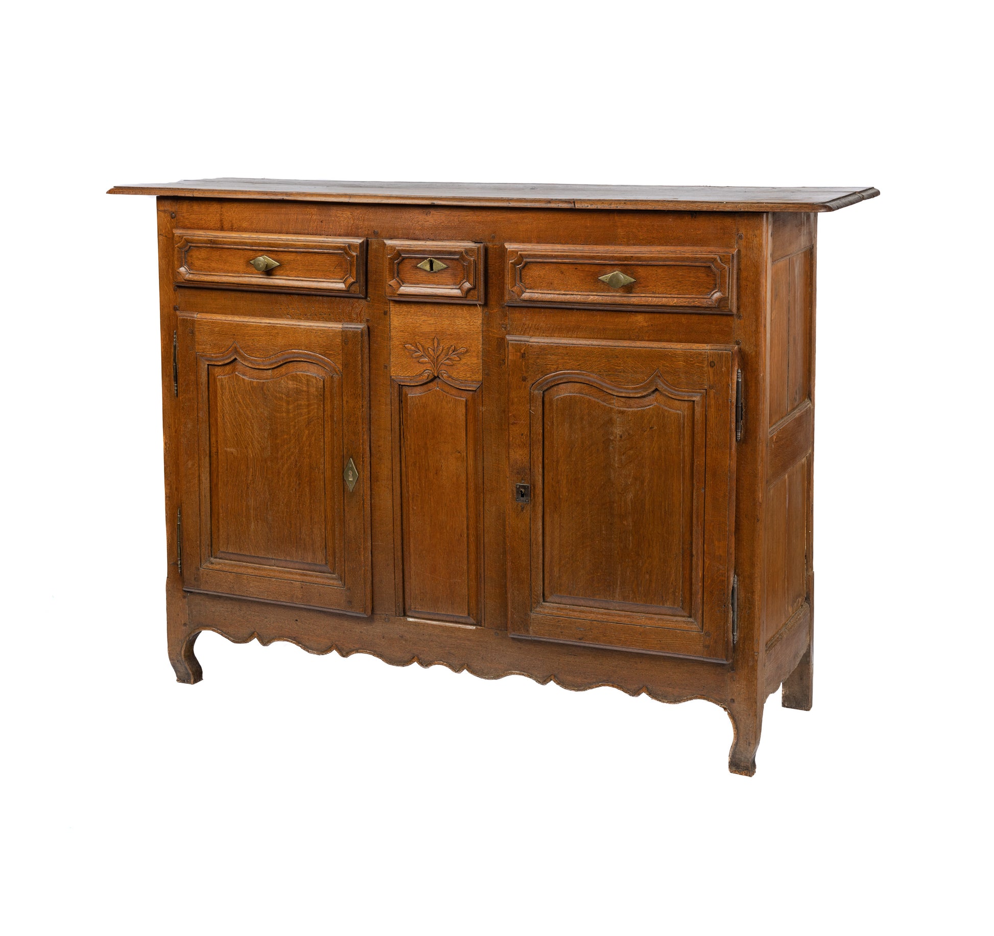 A charming 19th century antique French oak sideboard with brass hardware and some lovely timber carvings found in a grocery shop, in the French Alps. A nice size with good storage.
