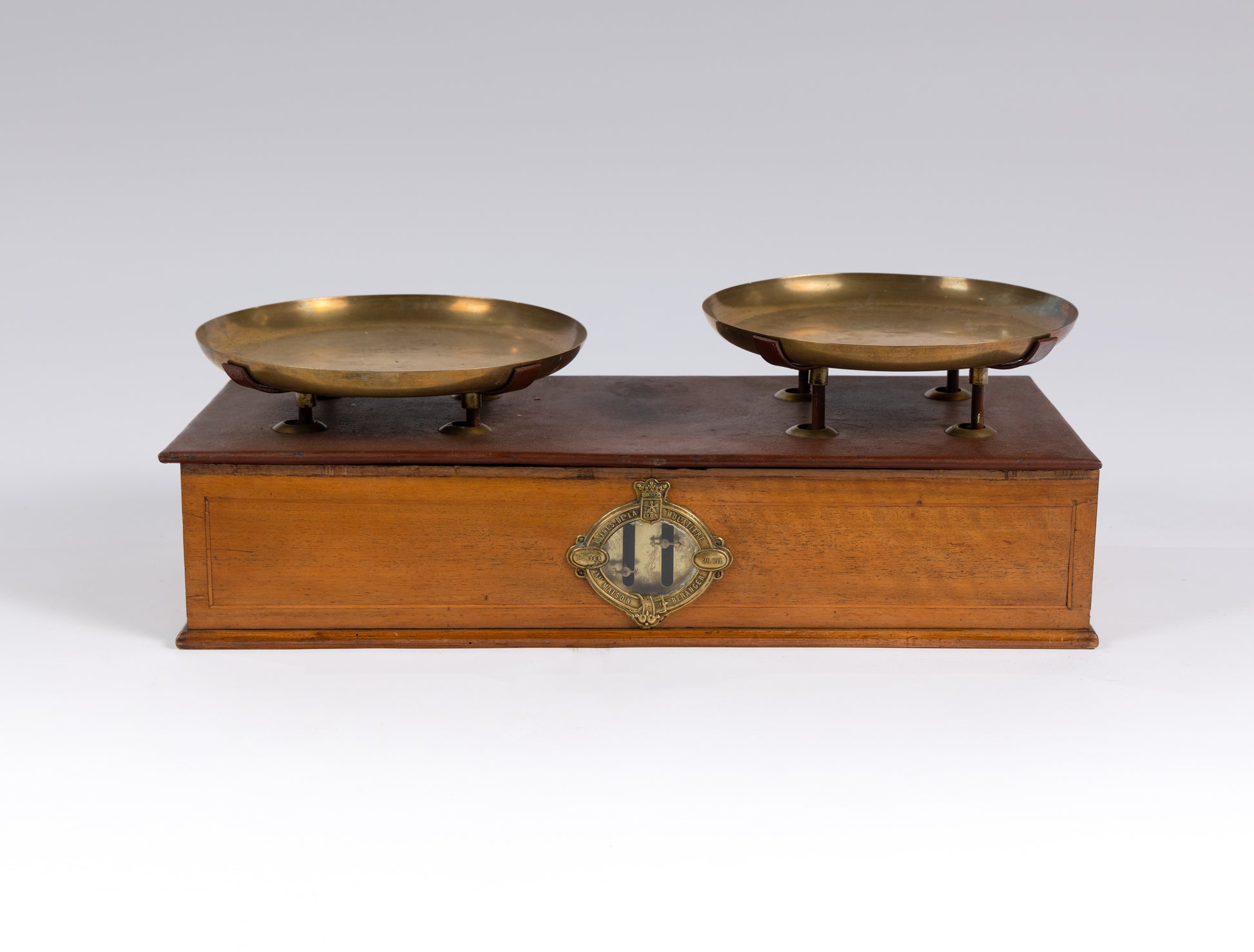 Impressive and beautiful set of large 20th century antique French scales with brass trays from The French Alps