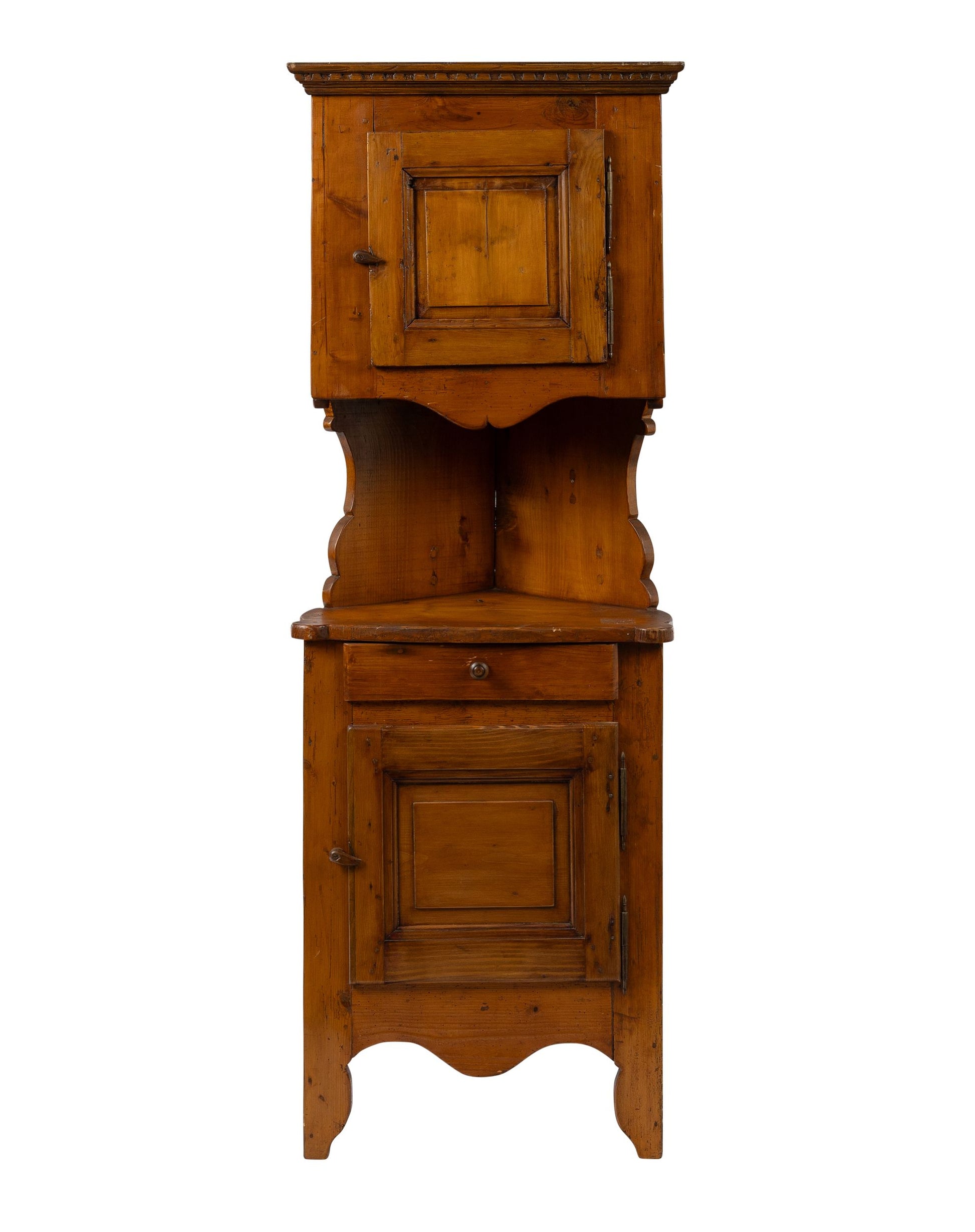 Antique French Alpine corner cabinet with lovely scalloped details and ample storage space
