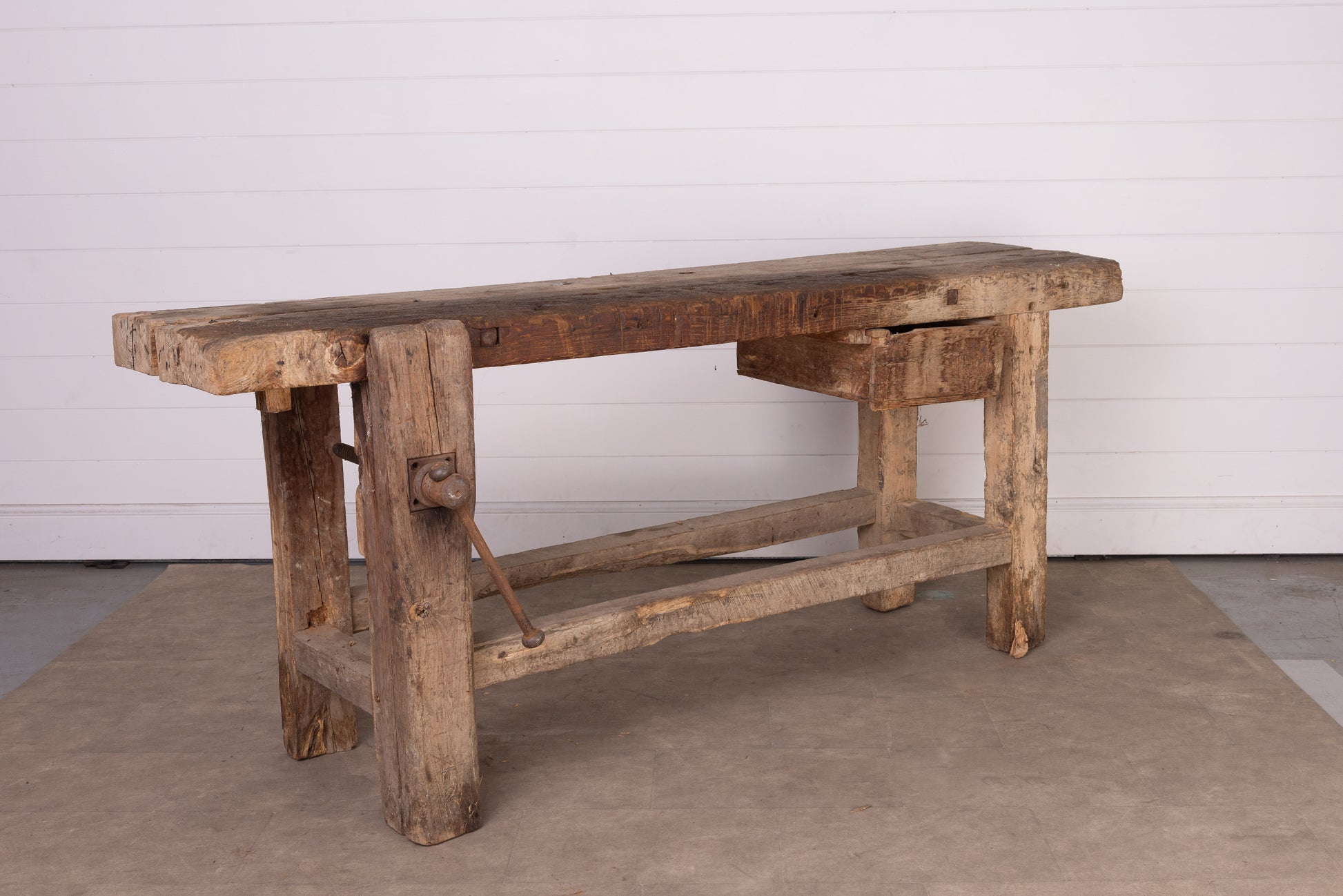 Antique French Farmhouse Etabli work bench from Megeve with vice and storage drawer Approx 79cm H x 177cm long x 34cm D
