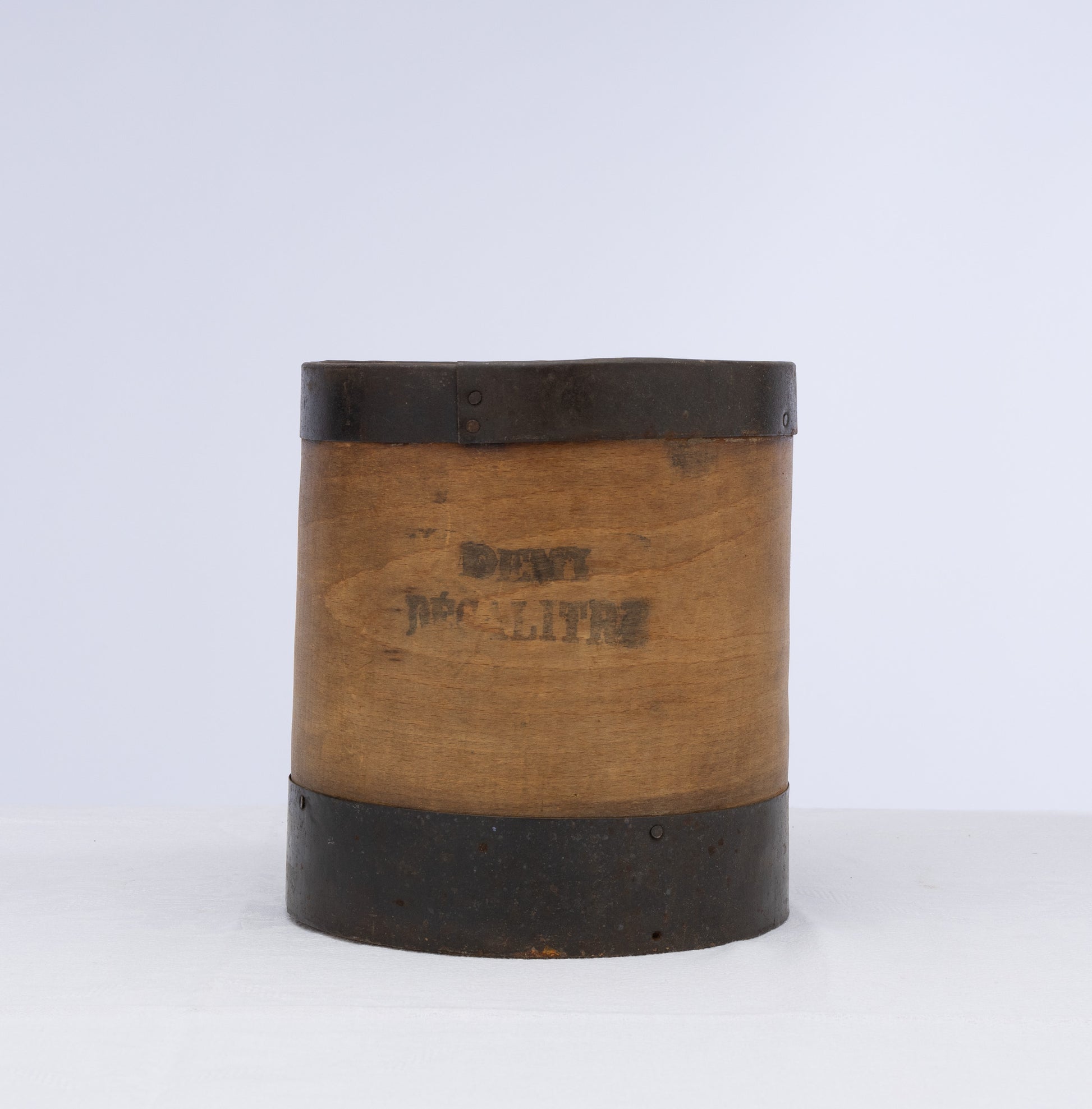 Vintage French timber 'demi décalitre' grain measure with metal bracing from Aix les bains